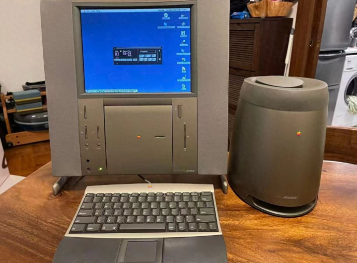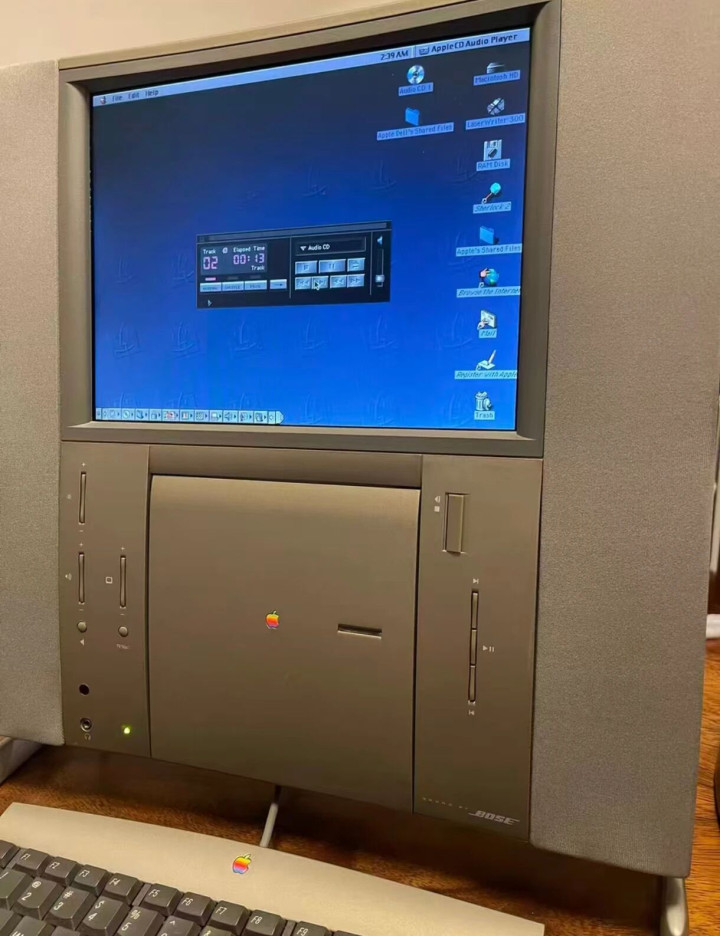Macintosh 20周年纪念版是苹果在1997年3月发布的台式电脑,可以算是一体机的雏形。屏幕下方还有一个前置的CD-ROM光驱,右边那个看似主机的东西,其实是BOSE定制的音箱。