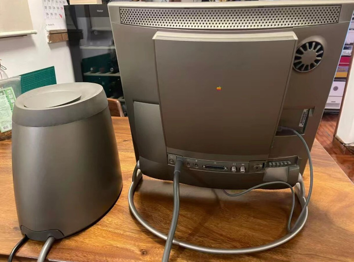 不过说实话,我第一次看到这照片的时候,还以为是背投电视呢,实在太像了。如果抠掉苹果的LOGO,在没有键盘做参照物的情况下,大多数人都会认成背投电视吧。另外这机器还是用彩色的苹果LOGO,到了1998年苹果图标就换成了纯色LOGO。