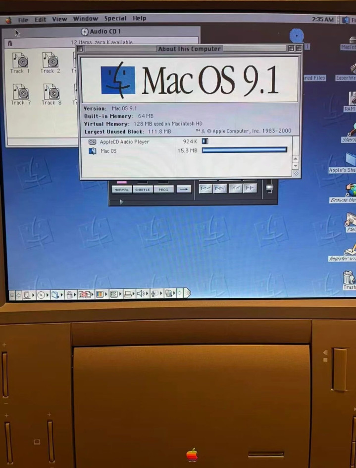 系统方面,照片显示在运行MacOS 9.1系统,但这肯定不是预装的原生系统,因为MacOS 9是1999年10月发布的,比硬件发布时间晚了2年半。MacOS 9对标的应该是微软的Windows98,我第一次去网吧用的就是这套系统。